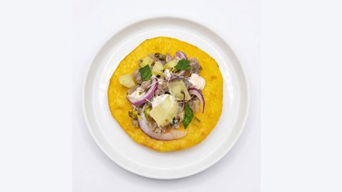 - Bocado de atún griego. Sobre encurtidos, con base de yogur y manzana.