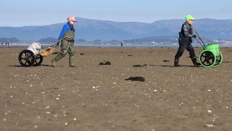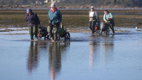 Mariscadoras de Cambados ayer en el banco de O Sarrido, «unha xoia»