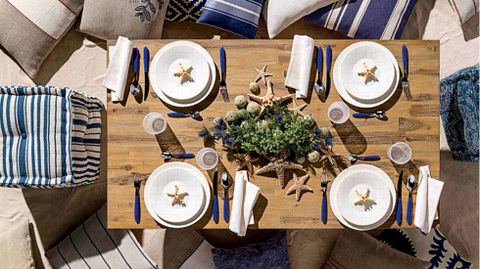¿Cómo? Sencillo. Una de las tendencias de la temporada en lo que decoración de interiores se refiere, se inspira en esos amaneceres a pie de playa y esa luz plateada que desprende. A base de añiles, blancos, tonos arena degradados, maderas y geometrías se logra traer la playa a casa, aunque la costa esté a cientos de kilómetros. Y no hace falta traer el pico y la pala: solo con pequeños gestos se puede lograr un cambio radical. Un juego de sábanas con hojas en tonos naturales, una toalla a juego y una lámpara de mesa con base de vidrio en azul pueden darle el toque que necesita el dormitorio. Para empezar el día con buen pie, un mantel con motivo de topos y una taza de desayuno de porcelana con temática del mar en tonos azules y naranja pueden provocar que se observe lo que nos queda por delante con otro punto de vista.