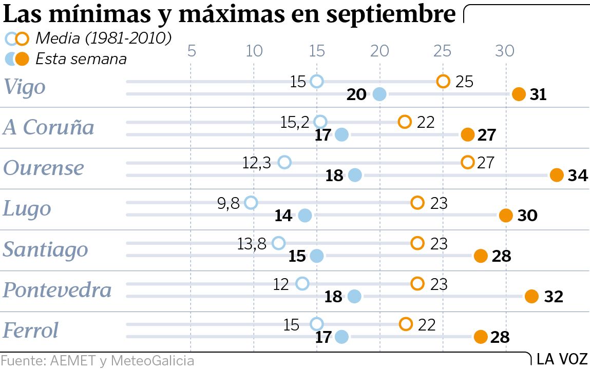 La posición actual del anticiclón, al norte de la Península, favorece además que llegue aire cálido. Durante los próximos días las temperaturas, tanto las máximas como las mínimas, serán muy elevadas respecto a los valores medios del mes de septiembre. Ayer el mercurio ascendió hasta los 35 grados y se espera que a lo largo de esta semana se puedan superar. Las anomalías positivas, valores por encima de la media, superan en muchos casos los siete grados. Especialmente llamativo será el caso de las mínimas. En las Rías Baixas se esperan noches tropicales.