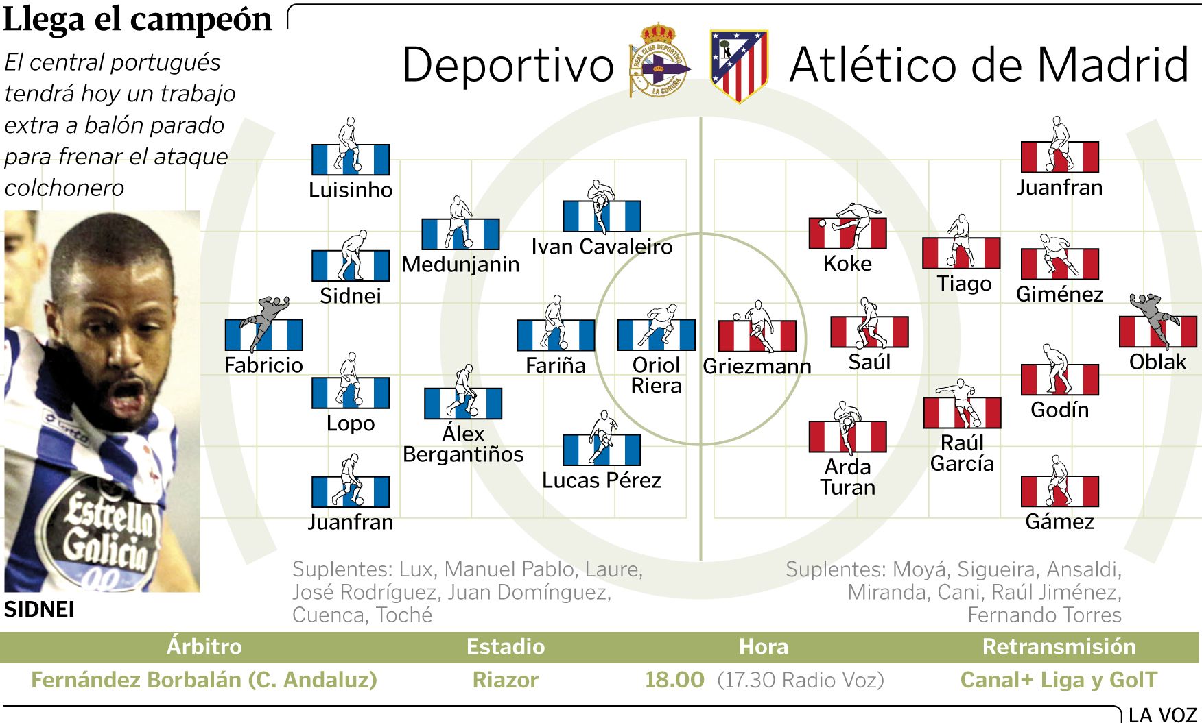 Un equipazo al que el Deportivo espera que le afecte visitar A Coruña en medio de la eliminatoria de cuartos de final de la Liga de Campeones. El próximo miércoles acude al Bernabéu después de haber firmado un empate a cero el pasado martes en el Vicente Calderón. Pese a la importancia del derbi, no está previsto que el Cholo reserve a sus puntales para esa cita. Hará un par de cambios obligados por lesión (Raúl García y Saúl Ñiguez jugarán por Mandzukic y Mario) y dos más por decisión técnica (Miranda y Siqueira dejarán el sitio a Giménez y Gámez).