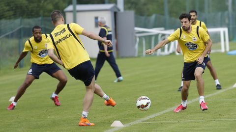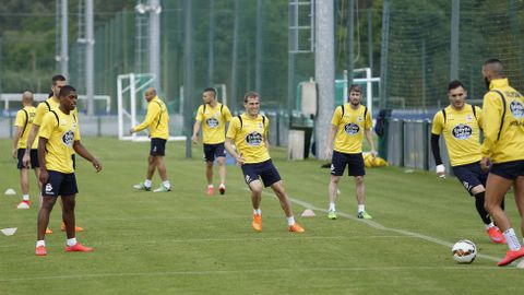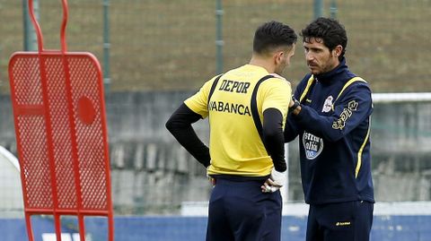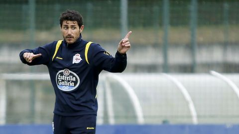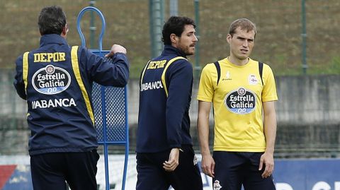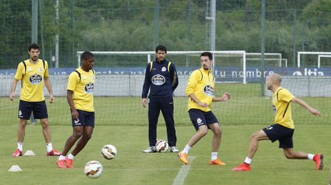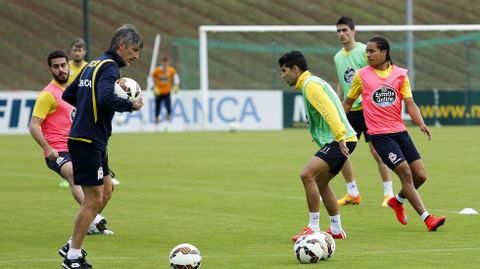 A las once de esta mañana, solo unas horas antes de pitido inicial, el entrenador del Dépor y los dieciocho futbolistas convocados pergeñan los detalles finales del encuentro sobre el césped del estadio de Riazor.