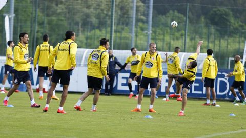 La práctica se convertía en una especie de terapia desestresante de los atacantes deportivistas, quizá los más exigidos de cara al choque de mañana, en el que únicamente vale la victoria y, por tanto, es imprescindible marcar al menos un gol más que el adversario para seguir en lucha por la permanencia hasta la última jornada. Estos se turnaban en el ejercicio de ataque y defensa que Víctor ordenó en la otra mitad de campo. Allí se planteaba una especie de abrelatas. Quizá sea como se espera que juegue el Levante. En apenas un palmo de terreno cuatro centrocampistas y dos delanteros trataban de abrir el camino hacia la portería tras sortear otras dos líneas bien pegadas de defensa y centro del campo. Rapidez de balón y profundidad para encarar al portero. Hasta allí los delanteros se acercaban en turnos de dos en dos cuando el entrenador los reclamaba. Mientras tanto, exprimían con una sonrisa sus últimas posibilidades de evitar las flexiones.