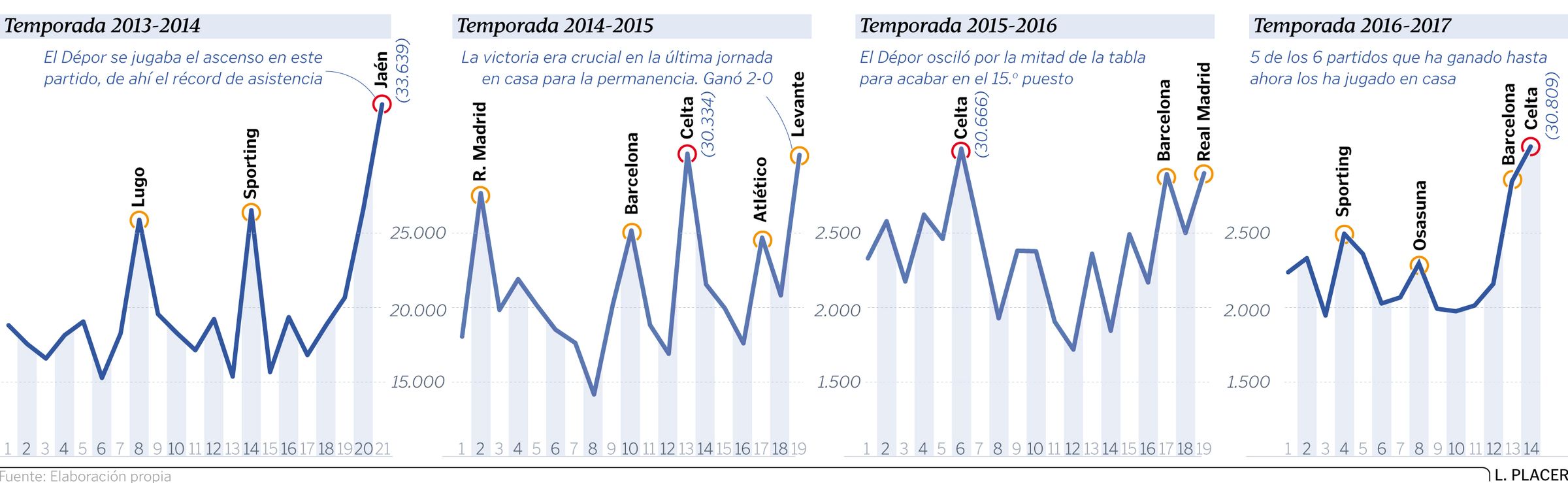 28 mar 2017 . Actualizado a las 05:00 h.Riazor guarda el secreto y las ilusiones de este Dépor. No se trata de una frase hecha. El espectáculo debe continuar y la carrera del equipo blanquiazul por la permanencia, los goles de Andone, Borges y compañía, al tiempo que la brillantez de rivales en los que juegan Messi, Cristiano o Griezmann, va paralela al impulso insuflado por los aficionados desde unas gradas cada vez más pobladas. Si hace cuatro campañas, la última en Segunda, la ocupación media en el estadio coruñés rondaba el 56 %, pasó en Primera al 65 % y se encaramó muy cerca del 73 % la pasada, ahora apunta al 70 %, cuando quedan los cinco últimos partidos en A Coruña, año tras año los más concurridos de la temporada.