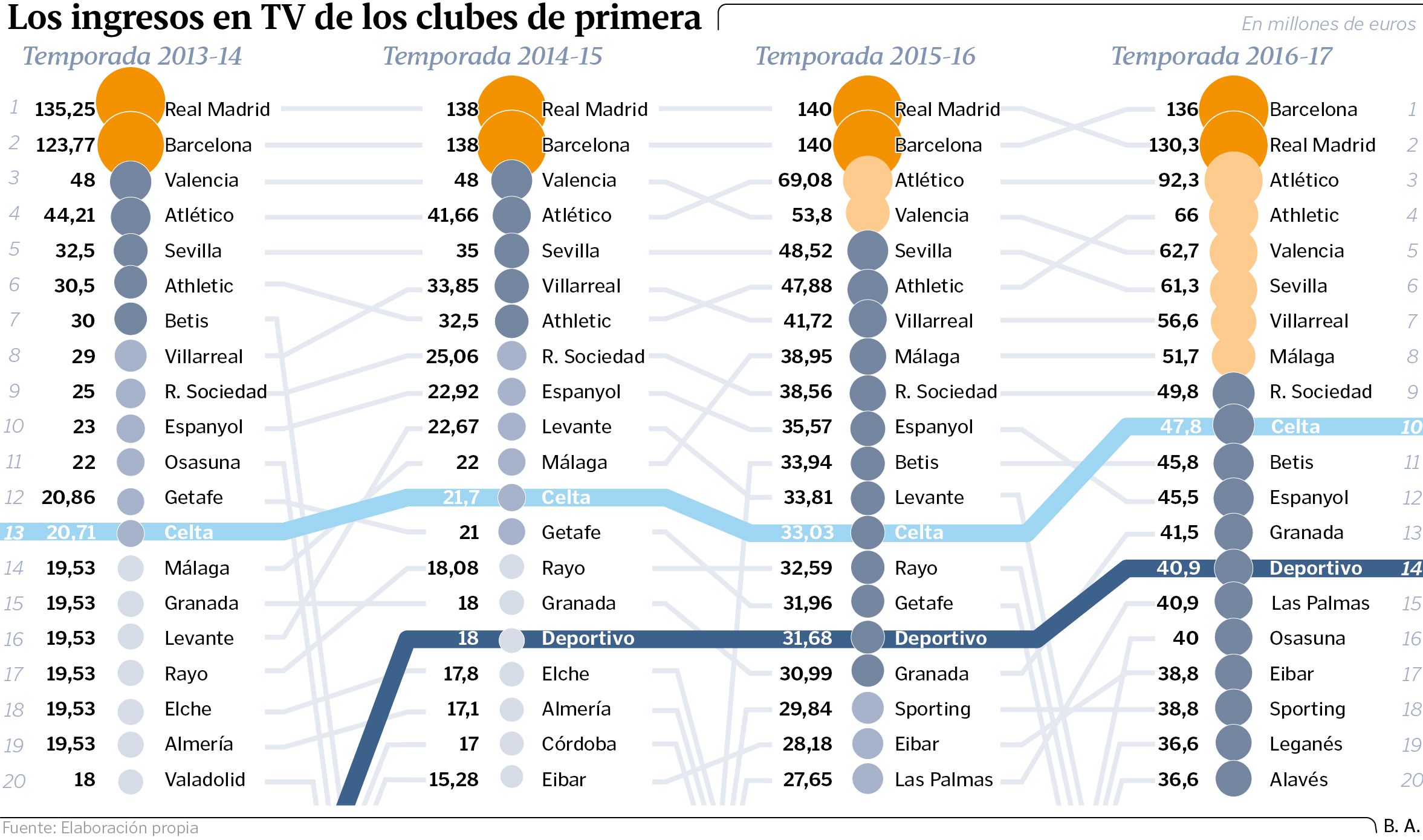 El Celta es el décimo en el ránking de ingresos (47,8 millones), manteniendo una gran evolución en los dos últimos años (33,03 en la 15/16 y 21,7 en la 14/15). Es decir, también ha doblado sus números desde la entrada en vigor del reparto centralizado de los derechos televisivos.