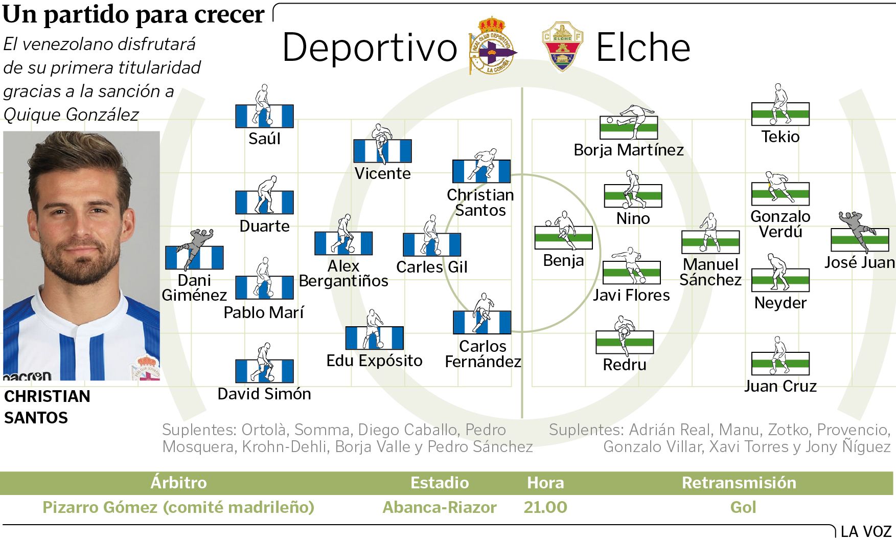 Más precaución tendrá con Borja Valle, dado que no será titular. El puesto de sustituto de Quique y, por tanto, pareja de Carlos Fernández será Christian Santos. El venezolano, que en esta ocasión no ha sido convocado por la vinotinto tendrá la oportunidad de estrenarse como titular: «Una buena respuesta a nivel de trabajo y futbolístico. Nada más. Como espero de cualquier jugador. Es el más fuerte que tenemos arriba en el juego aéreo y eso nos puede ayudar en ese sentido».