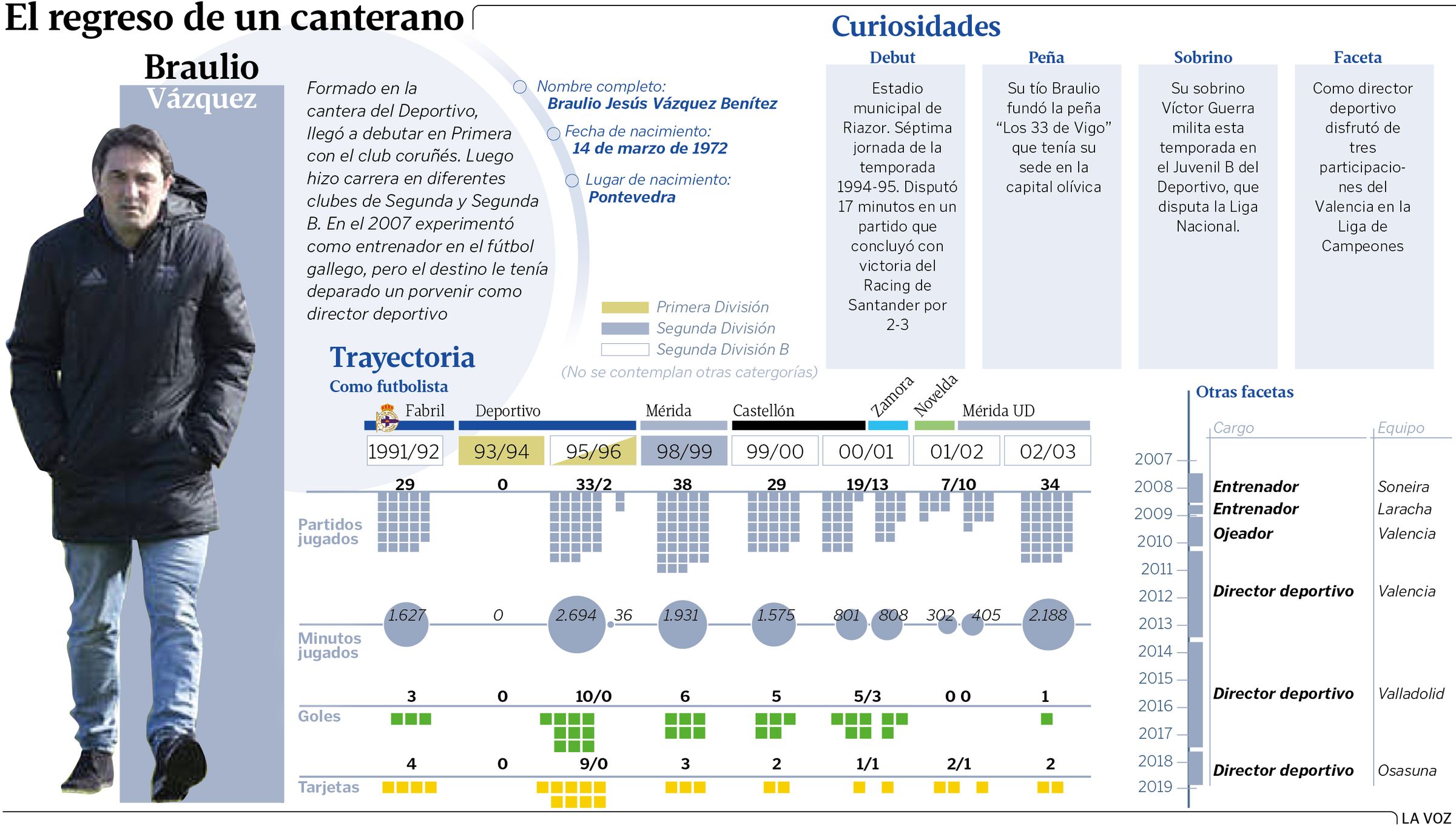 23 nov 2018 . Actualizado a las 05:00 h.En la Sagrada Familia dio sus primeras patadas a un balón. En el Deportivo creció y se hizo futbolista. La vida se la ganó recorriendo España y Portugal en diferentes equipos. Tras retirarse como futbolista probó fortuna como técnico en el balompié autonómico. Hasta que en el 2008, hace ya diez años, el Valencia lo reclutó para su equipo de ojeadores. Desde entonces, Braulio Vázquez Benítez (Pontevedra, 1974) vive su pasión, el fútbol, desde los despachos. Desde hace ocho años, como director deportivo (Valencia, Valladolid y ahora Osasuna).