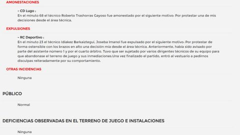 Tras el partido, el acta arbitral refleja, como motivo para la expulsión del técnico deportivista, «protestar de forma ostensible con los brazos en alto desde el área técnica». Asimismo, el escrito reconoce que Imanol Idiakez acudió al vestuario de los colegiados pidiendo «disculpas reiteradamente por su comportamiento».