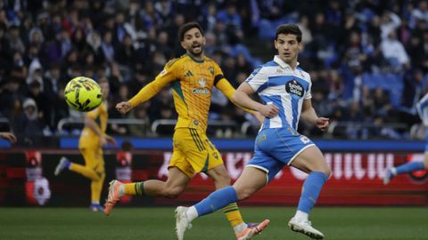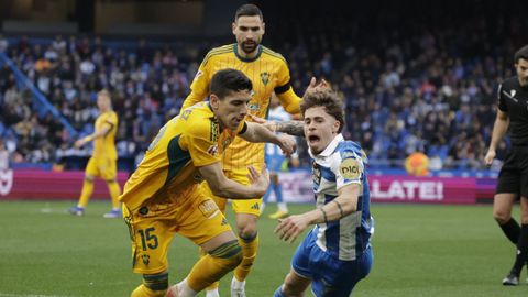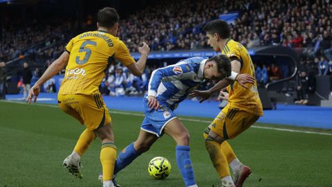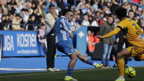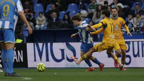 Hidalgo se inclinó por la velocidad de Mella y Eddahchouri para meter en aprietos a un Albacete pertrechado con tres centrales, pero que salía a la contra como alma que lleva el diablo. Los blanquiazules pusieron cerco a la portería del Albacete desde el primer minuto. Amasaron y amasaron sus ataques ante un rival con dos líneas de nueve jugadores por delante de Diego Mariño y que dejó solo a Jefté en ataque. Con Riki en el banquillo, llegado precisamente para hallar brechas en defensas numantinas, el Dépor acaparó el balón, pero la primera ocasión de enjundia se hizo esperar hasta el cuarto de hora, cuando un rechace en el área favoreció a Mario Soriano, pero este, escorado, no logró empalar su disparo con la izquierda. Otro disparo, alto de Luismi Cruz desde 30 metros que buscaba la cruceta de Mariño, anunció el 1-0, que salió de la chistera de Yeremay.