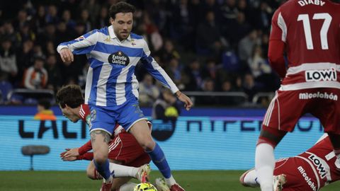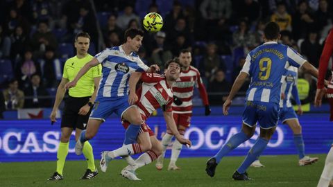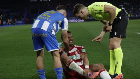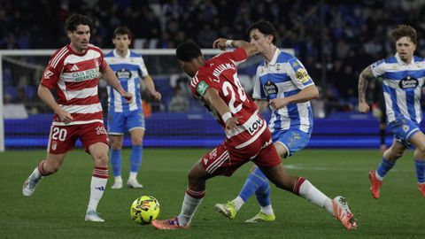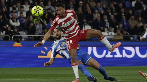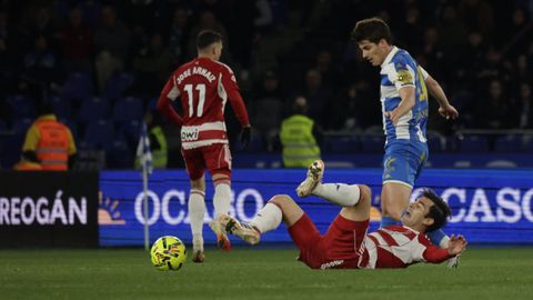 El Dépor jugó como pollo sin cabeza toda la primera parte, cuando repitió sensaciones de aquellos partidos de diciembre que tanto le ha costado olvidar. El Granada, que venía de dos derrotas consecutivas y veía acercarse de nuevo la zona de descenso, desnudó la defensa blanquiazul nada más saltar al campo. De área a área, tras un ataque en que el mal control de Zakaria le impidió conectar con Mario Soriano solo a su lado, Arnaiz chutó al lateral de la red del Dépor tras dejar clavado a Arnau Comas en el área. Poco después, otra vez otra vez el dorsal 11 visitante cogió la espalda de la defensa en un centro para rematar, aunque en postura acrobática, y que Ferllo detuviese seguro. Fue el ensayo del 0-1, pero antes Zakaria se plantó ante Luca Zidane, aunque él mismo, que tan bien había robado en la presión, se escoró demasiado y el portero acabó cerrándole todos los huecos.
