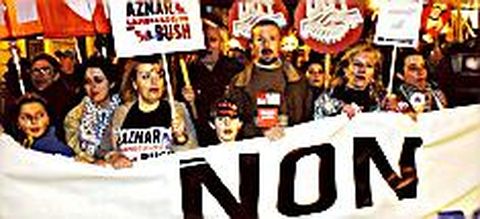 15 feb 2003 . Actualizado a las 06:00 h.El centro de Vigo paralizó ayer su ritmo habitual de ajetreo de compras, cafeterías y atascos de coches para volcarse en un atasco ciudadano con una negación común: no a la guerra era el grito más coreado y adornado de las más diversas formas. Banderas de todos los colores, republicanas, comunistas, anarquistas, nacionalistas coloreaban la marcha que serpenteaba con dificultad desde Via Norte a Montero Ríos sorteando las estrecheces de las obras del párking de Urzáiz. Ordenados por grupos, afectos a Izquierda Unida, a UGT, a CC.OO, al PSOE, al BNG, a la CNT, marcharon juntos y revueltos a pesar de sus discrepancias, y la única protesta que se oyó claramente fue contra la invasión de Irak. Animando la manifestación en un adelanto al carnaval, gente con caretas de Bush, malabaristas, un grupo de payasos de narices coloradas formando cual militares, voceiros con megáfono pidiendo una y otra vez a «compañeiros y compañeiras que se arrexunten, que somos moitos e non cabemos todos...». Por el camino se podía ver también estampas ajenas al clamor popular. Hamburgueserías llenas, pubs llenos de adolescentes, jóvenes expresando su postura: «!si total van a hacen lo que les salga de los huevos!», y en lemas y pancartas, noes a Aznar, «bandido, lacayo e mal nacido», al PP, «isto pasa por votar ós fachas», y otros, contra la guerra, contra ETA, o con el lema de la mani anterior, Nunca máis , que vale tanto para protestar contra la marea negra como contra la masacre e invasión en Irak.
