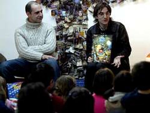 La librería Libros para Soñar, que dedica el presente mes de marzo al cómic, realizó ayer una sesión pensada para niños desde los 8 años de edad en adelante, para conocer de cerca a dos dibujantes gallegos, Kiko Dasilva y Andrés Meixide. Los artistas son los autores de dos álbumes titulados, respectivamente, Fiz nos biosbardos y Thom , recientemente editados en una nueva colección llamada BD Banda que distribuye Kalandraka. Algunos de los originales de estas obras estarán expuestos durante las próximas semanas para acercar a los más pequeños un trabajo creativo tan laborioso como lleno de ingenio. Las aventuras de Fiz y de Thom se dieron a conocer inicialmente en la revista Golfiño, que fue el «tubo de ensayo» de varios artistas interesados en fomentar el auge de las tiras cómicas en gallego. BD Banda también empezó siendo una revista, pero tiempo más tarde dio el salto editorial necesario para cubrir un vacío que existía en el mercado: por primera vez en la historia gallega del cómic, un fanzine se convierte en una colección de cómics. Dasilva (Vigo, 1979) és un artista plástico formado en la facultad de Bellas Artes de Pontevedra, humorista gráfico profesional que ha publicado en Kalandraka títulos como A Memoria das árbores , Moncho e a mancha o Rato de campo e Rato de cidade . Por su parte, Meixide (Vigo, 1970) comenzó su trayectoria artística como ilustrador para diversas editoriales gallegas y fue diseñador para una empresa de publicidad.