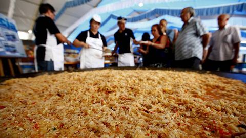 Un recipiente de 2,5 metros de diámero y 25 centímetros de fondo sostiene la receta, preparada según la tradición gallega