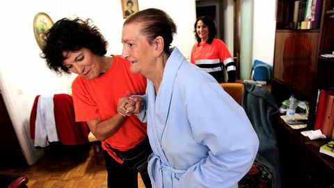 «No quiero ni pensar cómo me voy a arreglar sin ellos, es como si me sacaran un trocito del corazón, una desgracia; que no te pase nada porque te mueres», suspira María, una vecina del Casco Vello vigués. Para pisar la calle tiene que subir o bajar sesenta empinados peldaños. Sus 82 años no serían un obstáculo si no fuera por los 42 puntos de cada rodilla, recuerdo de una operación de las nueve que lleva encima. Dos cuidadoras la acompañan cada vez que va al médico o a la farmacia. Otras veces le llevan el carro de la compra. «El trabajo que hacen no tiene precio, me cuidan tanto como mis propios hijos y eso que son dos ángeles, tanto ellos como mis nueras, que no se merecen ese nombre». Como muchos residentes del barrio antiguo, vive sola porque sus hijos trabajan. Ni ella ni el resto de los usuarios tienen la puntuación suficiente para beneficiarse de la Ley de Dependencia de la Xunta de Galicia. Tampoco son independientes.