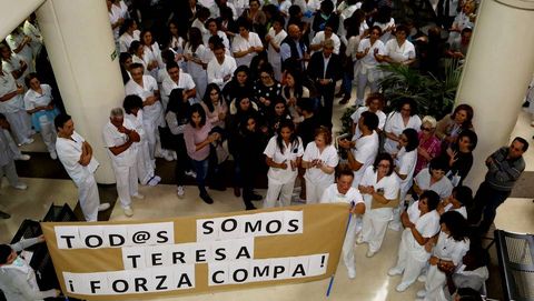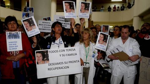 13 oct 2014 . Actualizado a las 17:34 h.Decenas de profesionales sanitarios se han concentrado esta mañana en el vestíbulo del Hospital Meixoeiro para manifestar su rechazo a la gestión de la crisis del ébola que está protagonizando el Ministerio de Sanidad. «Todos somos Teresa» o «Hai culpables, e non é Teresa» fueron algunas de las frases más coreadas, en solidaridad con la auxiliar de enfermería gallega a la que desde el ámbito político se ha culpado repetidas veces de su contagio.