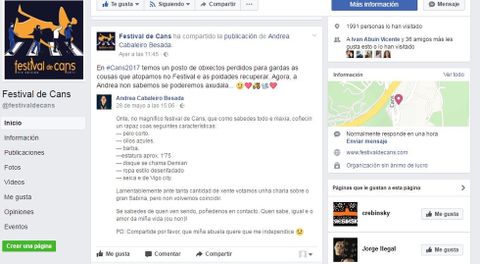Total, que en la organización del festival de Cans, que saben mucho de cortos y de amor, decidieron echarle una mano a la muchacha y compartir también en su perfil de Facebook, en el que tienen más de 34.000 seguidores, esta historia. Por supuesto, con un toque de humor sobre su apartado de objetos perdidos: «En Cans2017 temos un posto de obxectos perdidos para gardas as cousas que atopamos no Festival e as poidades recuperar. Agora, a Andrea non sabemos se poderemos axudala...».