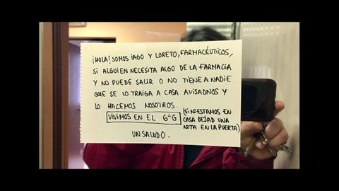 Los portales son también buenos tablones de anuncios para ofrecer servicios. En un inmueble de la calle Rosalía de Castro, dos farmacéuticos que residen en el edificio han puesto un cartel en el que se ofrecen a llevar a sus vecinos lo que necesiten.