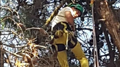 La dirección del cámping contrató ayer una empresa especializada en poda en altura para inspeccionar el eucalipto dañado y serrar la copa por razones de seguridad. La poda se realizará este viernes por la mañana a fin de evitar riesgos a los demás acampados. Durante la tarde de ayer, los operarios montaron las cuerdas de seguridad y mañana podarán la parte más alta del árbol.