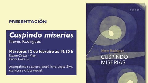 A las 19.30 horas, en la Asociación Évame Oroza, se presenta Cuspindo miserias, de Neves Rodríguez. Acompañando a la autora estará Inma López Silva.