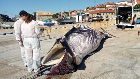 Con mucho esfuerzo la consiguieron acercar hasta la zona de Area de Bon. Allí, por fin, un equipo de Gardacostas les ayudó a recogerla. «Foi trasladada ao porto de Aldán. Alí vararon ao animal para trocealo», indican desde el Cemma, que aprovecharon para hacer allí la recogida de muestras y la necropsia. Allí, , finalmente, fue retirada la ballena. «Faltou apoio e medios para ter solucionado doutra maneira a situación. Queríamos evitar que a balea acabara noutra zona inaccesible ou que puidera ser un perigo para a navegación marítima», continúa un miembro del Cemma, que insiste en que «tiveron que tirar dela dúas persoas, unha delas un avó con dor de moas», explica. Además, esperan que este caso sirva para establecer un protocolo para futuras situaciones similares.