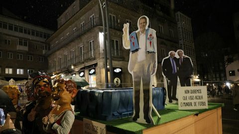El meco, que fue entronizado en la Porta do Sol, no deja lugar a dudas. La imagen de Abel Caballero aparece, con sendas bufandas del Celta posadas en sus hombros, junto a una maqueta del estadio de Balaídos ya acabado y con un cartel que sentencia: «Vigo sede do mundial 20230. ¡Viva Vigo!». En el polo opuesto del meco se sitúan los presidentes de la Xunta y de la Federación Española de Fútbol, con sendos martillos en la mano, en actitud de compadreo. A sus pies, como si de una película muda se tratase, una leyenda explica el asunto: «¡Non queremos que Vigo acolla o mundial de fútbol!».