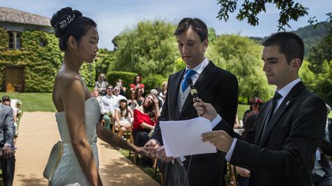 El concejal Diego Garcia Moreira, el más políglota del equipo de gobierno, ya ha oficiado en francés e inglés. Ese fin de semana casó en el Pazo da Touza al tenor Jorge Prego con Yang Liao, originaria de Pekín. La pareja se conoció en la Universidad de Yale cuando eran estudiantes y ambos viven ahora en Nueva York. Este fin de semana le toca el turno a un madrileño con una mujer de nacionalidad polaca. El idioma no es un hándicap, pero tampoco los distintos ritos de cada cultura. La temporada alta de bodas en el municipio de mayor turismo nupcial de la comarca miñorana arrancó con una boda judía entre franceses en el pazo de Cea y en la de Jorge Prego con Yang Liao, se cumplió con el ceremonial del té, el evento más importante en una boda china moderna.