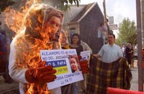 26 jun 2002 . Actualizado a las 07:00 h.El padre separado Jorge Ferreiro decidió plantarse fuego en la mañana de ayer ante los juzgados de Porriño para demandar un régimen de visitas a su hijo «digno». La custodia compartida determinada por un tribunal porriñés le permite ver a su niño, de 4 años, dos fines de semana alternos al mes y parte de las vacaciones de verano. En cualquier caso, según explicó ayer Ferreiro, ha denunciado a su ex-compañera en varias ocasiones por incumplir la sentencia. Pero «la Justicia la absolvió y nunca la castigaron», matizó. Ferreiro se quemó junto al presidente de la asociación SOS Papá, Alejandro Urcera, quien recientemente se subió a una estatua en Vigo para reclamar ver a su hijo. Se quemaron, pero a medias. No sufrieron daños pues estaban protegidos por trajes especiales. Ambos dicen que se sienten indefensos y que es la desesperación la que les lleva a protagonizar este tipo de actos. Ferreiro aseguró que continuará en esta línea a pesar de los «impedimentos, chantajes o coacciones», pues su único fin es poder ver a su hijo con más asiduidad y que la familia paterna pueda disfrutar del niño en la misma medida que lo hace la materna.