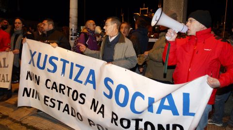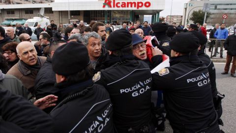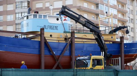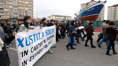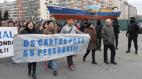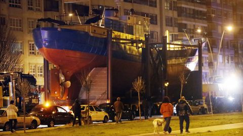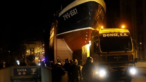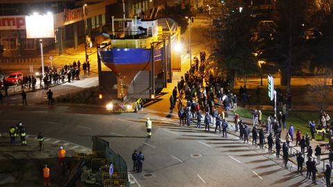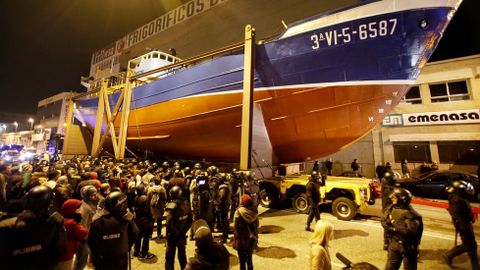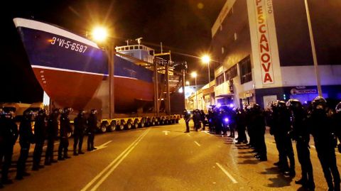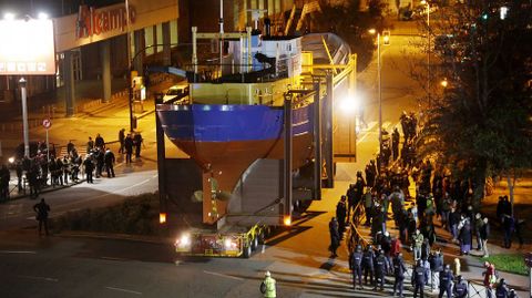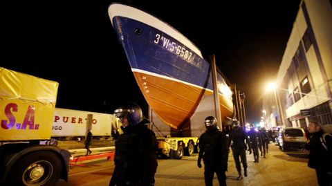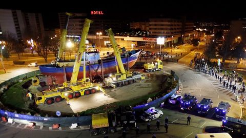 Antes de iniciar el recorrido que llevaría el barco hasta la polémica rotonda, los guardias de seguridad rodearon a los manifestantes que esperaban por el inicio del traslado para impedir que entorpecieran la salida mismo. Tras unos momentos de tensión, el pesquero consiguió seguir adelante hasta topar en la avenida Castelao con un grupo de vecinos encadenados. Fue en este punto donde se produjeron los disturbios más graves, después de que la policía cargara contra los manifestantes intentando arrancarles las cadenas. Algunos han tenido que acudir a urgencias.