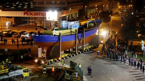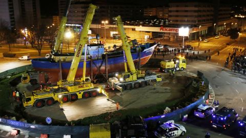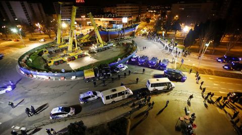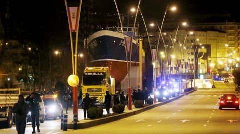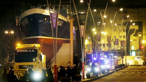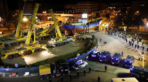 A pesar de todas las acciones llevadas a cabo por los vecinos, finalmente el barco consiguió llegar a la rotonda, donde un amplio despliegue de policías y furgonetas harán guardia en las próximas horas para asegurar que la polémica construcción se lleve a cabo.