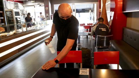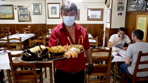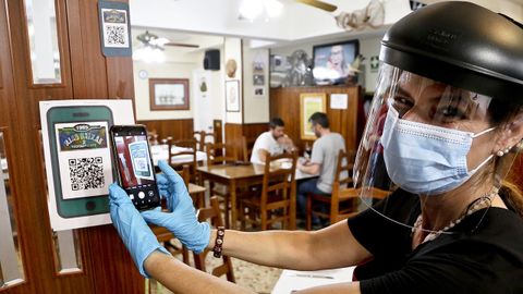 La dueña del restaurante Rías Baixas 2, Cristina Silva Barreiro, reabrió ayer y los primeros clientes encargaron una parrillada de mariscos. El camarero carretaba bandejas caminando por un circuito pegado a la barra para no cruzarse con nadie. También hay QR pero si el comensal carece de la aplicación lectora en su móvil, el camarero le canta los platos.