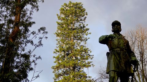 Cientos de bolas doradas, muchas ya algunas rotas en el suelo, cuelgan de la imponente araucaria centenaria que se encuentra en el extremo de la plaza de Compostela más cercano a la calle García Olloqui para sorpresa de los viandantes. Durante el período navideño, el árbol de gran porte, que mide cerca de 30 metros de altura, fue utilizado como soporte de las figuras esféricas. Además fue cableado en todo su perímetro para añadir más puntos de luz al festival eléctrico, ampliado hasta el sinsentido por el Concello una semana más en la que la ciudadanía ya había pasado página con toda la parafernalia de vuelta al trastero.