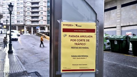 Hay otros detalles que contribuyen a dar la impresión de que el tiempo se ha parado en esta ciudad como si fuese el Día de la Marmota. Por ejemplo, los carteles pegados por Vitrasa en paradas que siguen indicando que los autobuses de la compañía de transportes han modificado o anulado paradas de su trayecto habitual debido a los cortes de tráfico en el período navideño.