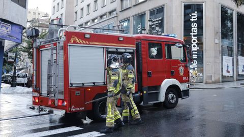 Los bomberos retiran cascotes de una fachada y extraen agua de unos bajos inundados en Vigo