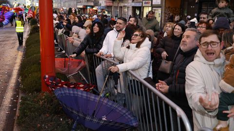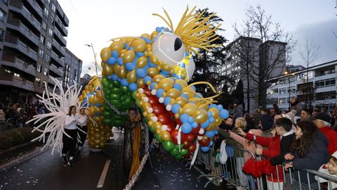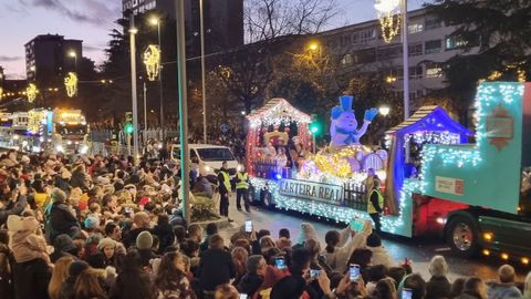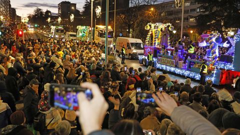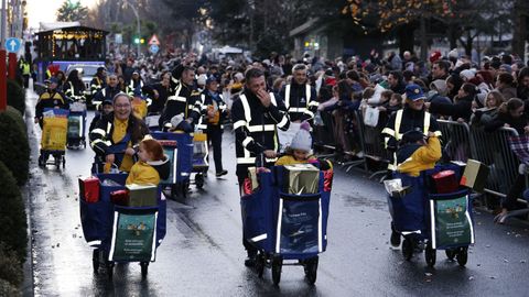 Tras todos ellos se situaron las cuatro carrozas de los Reyes Magos y la Cartera Real. Todos los vehículos estuvieron llenos de niños y niñas cargados de caramelos que lanzaban a discreción contra el público. Y tras ellos, cerrando el desfile, llegaron un grupo de automóviles clásicos, el Nadal Bus de Vitrasa y los bomberos, siempre recibidos con entusiasmo por la población infantil.