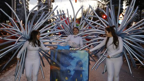 La columna de la alegría estuvo compuesta por once carrozas, grupos de animación de calle, bomberos, Policía Local de Vigo, varios vehículos clásicos e incluso un grupos de carteros de verdad, de los que trabajan en Correos y llevan carrito. También se unieron al paseo las personas de la asociación DisCamino.
