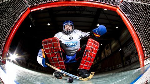 Empecemos por abajo. Lo primero que nos encontramos son los patines, que ya pesan lo suyo. Van cubiertos parcialmente por la parte inferior de las guardas, que suben hasta más arriba de la rodilla. Esta es quizás la pieza que más impresiona, pero tras el primer pitido del partido empiezas a entender el porqué de tanto despliegue. Y es que los porteros se pasan la mayor parte del tiempo en cuclillas, por lo que esta especie de macroespinilleras les protegen hasta el pecho. Y falta les hace. Si seguimos el recorrido por este cuerpo serrano llegamos a las rodilleras, fundamentales para seguir conservando el menisco cuando le alcanza alguna bola. Pero no llevan todo esto directamente sobre la piel. Por debajo va una malla reforzada que sirve de segunda piel y sobre la que también se visten las medias y el pantalón de portero acolchado. Esto ya es para asarse, y todavía vamos por las piernas. Entre ellas y bien sujeta por la coquillera hay que encajar la coquilla, esa pieza que se encarga de asegurar la paternidad del que la lleva. La pechera con hombreras es lo que remata el grueso de la protección interna, una especie de chaleco que impide que la bola se encuentre directamente con el cuerpo. A esto hay que sumarle las coderas, que les permiten impactar con la pista y salir ilesos. ¿Y los guantes? Ríete tú de los de boxeo. Estos son mucho más grandes y cuentan con un acolchado plano que les deja parar las bolas directamente con las manos, sin dolor. Antes se ponen todavía otros más finos: las guantillas, que evitan roces con esas manoplas con las que más vale que nunca te den un sopapo. El collarín y un casco a prueba de bombas con visera de protección facial completan el armamento de los porteros. Solo el vientre se queda sin protección, por ser la zona menos expuesta.