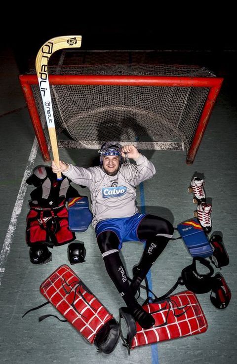 Pero ¿qué se siente al llevar todo esto puesto? «Hay que pensar que pasamos la mayor parte del tiempo agachados, por lo que no se nota tanto el peso. Al ponerse de pie sí que se siente algo más», dice Jorge. Cuando le contamos que es el deportista que más cosas lleva encima, dice que es muy posible. El hockey hielo anda ahí, pero en ningún otro deporte hay jugadores que vayan cubiertos de los pies a la cabeza y con tanto cachivache. Lógico que disfruten el momento de quitárselas, esos segundos de gloria en el que se secan el sudor, beben un buen trago de agua y respiran hondo. Y tan hondo. Eso que aquí Jorge no se ha quitado todo, que la cuestión no era obligarle a hacer un streptease. Aún lleva la equipación y, cómo no, el stick. ¡Qué moral!