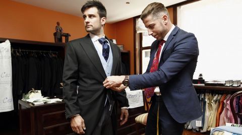 Lo primero que llama la atención cuando estos dos chicos de la imagen -Alejandro y Álex- se prueban sus respectivos trajes es que les quedan tan entallados que por momentos da la sensación de que el margen para agacharse es poco. Pero es verdad que de pie están impecables. ¿Esto es moda o es marca de la casa? Les pregunto a los encargados de la tienda de Félix Ramiro, un templo ya de los trajes a medida, que lleva tres meses abierta en A Coruña. «Es nuestra filosofía, pero también es tendencia, ambas cosas; Félix, el sastre que dio nombre a la marca, siempre dice que nos caracterizamos porque los trajes son entalladitos, muy justos, con líneas frescas y jóvenes, pero que le sientan bien a cualquiera», explica Diego, uno de los encargados de la tienda. Solo con ver cómo va vestido se entiende que la mezcla es el ideal de hoy: viste traje azul marino con cuadros ventana de líneas rojas, una camisa de rayas, corbata azul marino con topos y un pañuelo con flores también en tonos rojos. «Cuadros, flores, rayas, lunares...». ¡El traje es ahora una fiesta! «Bueno, a mí me gusta ir así, pero cada cliente es un mundo; en cualquier caso, de base está el azul marino y el rojo, que son dos colores que funcionan muy bien, pero sí, hoy se puede combinar casi cualquier cosa». A su lado, Ángel, otro de los responsables de este negocio, avanza que «este es el año de los azules, en toda su gama». «Hasta los chaqués de boda más clásicos han venido en ese color, el traje azul marino de siempre es un básico indispensable, pero para las personas más arriesgadas el azul se amplía con otra gama».
