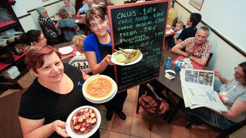 La carta cuenta con 18 platos diarios a elegir y cuatro postres. El precio va en función de lo que el comensal pida y cómo. «Callos con garbanzos, empanadas e carne asada son as nosas especialidades», explica Madga, la camarera más veterana del local, quien añade que también ofrecen chipirones, pulpo, mejillones en escabeche, empanadas, carne asada o al «caldeiro» o guisado de gallo de Mos. Este último plato, el más caro. La ración cuesta 12 euros y le sigue el pulpo, a 10 euros. El resto de las raciones oscilan entre los cuatro y los diez euros. El local está abierto de lunes a sábado. Los jueves, viernes y sábados, además de servir comidas, también ofrece la posibilidad de cenar. «Nunca se reserva. Isto funciona por orde de chegada. Agás os días que servimos ceas. Reservamos de 21.30 a 22.30», explica Magda. En cuanto a los platos que se suelen demandar y la cantidad, depende. «Segundo os gustos así van pedindo. E en canto á cantidade, teño visto comer a dous igual que a dez», confiesa.