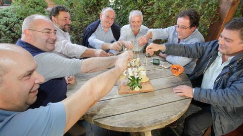 Hablamos del Restaurante La Palloza, donde si te la dan con queso que sepas que siempre es para bien. Que se lo diga si no este grupo de amigos (foto superior), que le dan al palillo con mucho queso y buena conversación. Ramiro López, el propietario del establecimiento, les ha preparado con mucho esmero una tabla a la que no le faltan manos. Para muchos estómagos sería la salvación... Ni qué decir tiene que no hicieron falta tenedores. Con un soporte de madera y unos palillos más que suficiente. Para la elaboración de esta tabla, este veterano hostelero de Lugo echó mano de tres tipos de quesos: San Simón, queso azul gallego y de Arzúa-Ulloa. «Una tabla de quesos es una opción muy recurrida para picar entre amigos mientras se toma un vino o una cerveza», advierte Ramiro, quien subraya que este clásico del palillo, el queso, se ha convertido incluso en una opción imprescindible en ceremonias y banquetes.