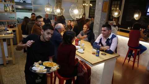 El Café de Altamira es un ejemplo claro de la puesta al día que están teniendo las tabernas urbanas en Galicia. Se nota en la juventud del equipo, en la revisión de la cocina de mercado y en la disposición del comedor, en el que una gran mesa corrida se ha convertido en su mejor seña de identidad. Tanto la mesa como los bancos tienen ruedas que permiten otras configuraciones puntuales, y además las hay más pequeñas, pero cuando estas se ocupan la idea es ir llenando los espacios a lo largo. Como se trata de uno de esos locales al alza en Compostela, es muy habitual que diferentes grupos y parejas acaben sentados en la pieza más larga. La filosofía de esta disposición es tan simple como casera: «Donde comen cuatro, comen seis, solo hay que arrimarse», explica Álex Oubiña, el jefe de sala, quien asegura que grupos de desconocidos se han convertido al menos en conocidos tras pasar por el Altamira. Curiosamente, los clientes locales son los que tienen más reticencias, mientras que los extranjeros, «ninguna». Como el restaurante está frente a la Praza de Abastos, uno de los espacios más visitados por los turistas, la mezcla suele salir bien y siempre hay quien da pie para cruzar conversaciones. Si lo que se quiere es un poco más de intimidad, un centro con flores divide la mesa y concede cierta distancia a los comensales, que se muestran más extrovertidos cuanta más edad tienen, según Oubiña. La apuesta es firme, funciona y a ello ha contribuido el cambio que Marcelo Tejedor le dio a su restaurante de la rúa As Hortas, donde también reúne a sus clientes en torno a una mesa alta con una veintena de puestos.