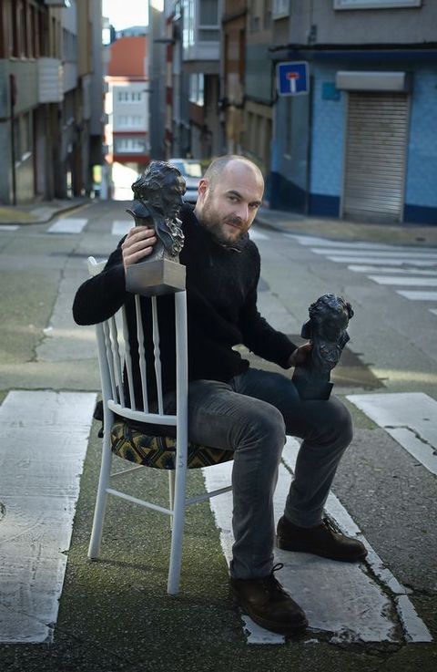 Es el hombre récord del cine español. Un gallego capaz de salir de la gala de los Goya con dos trofeos bajo el brazo. Dos premios de animación. El único que lo ha conseguido hasta el momento. Uno al mejor cortometraje, por Decorado, y otro por la película Psiconautas. Bueno, en realidad salió de la gala con uno porque el otro cabezón (como se conoce a la figura del premio) se lo llevó (físicamente) el productor. «Lo que me importa son los premios, no las estatuas. Prefiero que las tenga la familia que les hace mucha ilusión. En realidad a todos mis amigos les mola hacerse la foto con el Goya», comenta Alberto Vázquez, de 36 años, en el luminoso salón de su casa. En una mochila de la marca Speedo porta el Goya que obtuvo hace unos años por Birdboy y el otro en un caja de madera que encargó su padre ex profeso a un carpintero. Me hizo ilusión pasear por el barrio de Monte Alto con la caja que recuerda, aunque un poco rechoncha, a las que había en las casas con la imagen de un santo. «Y con una ranura para echar las monedas», apunta Alberto, que se siente cómodo en esta zona de la ciudad de A Coruña donde hay pocos negocios abiertos y donde existe la posibilidad de posar sentado en una silla que, por cierto, encontramos al lado de un contenedor, y que no pase ningún coche mientras realizamos la sesión. Después del paseo regresamos a su casa con los Goya. Pesan, y más cuando hay que subir con ellos hasta un quinto piso sin ascensor.