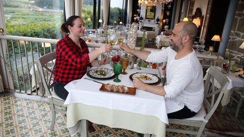 El comedor, completamente acristalado, inundado de luz y color, se abre al valle del Salnés. Y es allí, entre huertas y viñedos y con el salitre del cercano mar adivinándose en el ambiente, donde el grovense Julio Ouviña, responsable de los fogones, encuentra el ideario de su cocina. «Una cocina de mercado que aprovecha en cada temporada lo que tiene a su alrededor», resume. Que, desde luego, no es poco. Las primaverales ensaladas -como la de vieiras con frutos secos y de temporada-, las delicadas tempuras, los recurridos huevos rotos con verduras y jamón ibérico o la demandada brocheta de rape y langostinos -un plato que jamás han podido retirar de la carta- dan fe de ello. En el apartado de carnes, el plato estrella es el solomillito ibérico con puré de castaña, cebolla confitada y manzana caramelizada, otra genuina representación de la atinada impronta culinaria de la casa.