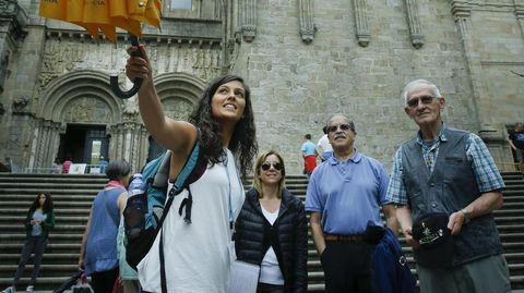 08 ago 2017 . Actualizado a las 14:43 h.«Hola, soy Raquel, vivo en Santiago, gracias por venir con nosotros a conocer la ciudad». Y de ahí al lío. Que si catedral, que si rúas o museos... Lo que toque de camino. Una vez abandonamos Platerías, punto de partida de esta ruta que sale dos veces a diario, solo hay que dejarse llevar y confiar en esta santiaguesa de 27 años que es guía turística acreditada. Lo primero que nos llama la atención es su paraguas amarillo. No lo trae porque piense que en cualquier momento va a caer un chaparrón, que podría ser porque estamos en Santiago, pero no. Tiene otra función o más bien varias. «Sirve para identificarnos, somos de la Asociación de Guías de Galicia, los primeros que hicimos rutas en Santiago y los únicos que las hacemos todo el año. Además, abres el paraguas y quien te encuentre te encontró. Sea verano o invierno, el amarillo destaca», explica. Sin perderla de vista nos ponemos en marcha. Raquel nunca sabe con antelación con quien se irá de ruta. La mayoría de sus clientes dan con ella, o con algunos de sus compañeros, gracias a la información que hay en hoteles o en agencias de viaje. «Yo 15-20 minutos antes de la salida estoy por allí, y con los que haya salgo. Lo mismo son 2 que 30, que es el máximo, aunque si hay mucha gente llamamos a otro compañero y nos repartimos porque preferimos grupos más pequeños. Además, porque por ejemplo en la catedral las visitas son de grupos de 15». Por el bien de los turistas y de su voz, aunque si hay que levantarla tira de audioguía.
