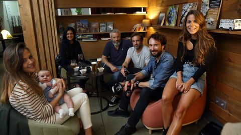 Rebeca con el pequeño Teo en brazos, Nuria, Pablo, Iago, Dani o Alicia (de izquierda a derecha) no faltan un viernes a su cita en La Consentida, en Alfredo Vicenti, en A Coruña. Vale, que está a pocos metros de Raz, la tienda de surf que tiene Dani Gambón en la calle de atrás y es una pasión que los mantiene unidos desde hace años, pero a otros miembros del grupo que no pudieron quedar para este reportaje no les pilla tan cerca y se desplazan igualmente hasta aquí. «En concreto nos gusta este rincón, si está libre allá vamos, pero los viernes suele haber bastante gente así que nos acomodamos donde sea», explica Dani. Las cañas de los viernes en La Consentida son un ritual para estos amigos, con algo de picar entre medias por supuesto, pero si tienen oportunidad también se dejan caer el jueves o el sábado al aperitivo. «A ver, aquí estamos muy a gusto, antes íbamos a otros, pero desde que abrió no salimos de aquí». Bueno, salir sí salen porque en el grupo hay pequeños a los que a cierta hora el cuerpo les pide casa, pero un par de horas no se las quita nadie. Y aunque pueden presumir de ser los clientes más fieles del local, si tienen que esperar para coger mesa lo hacen. «Solo reservamos si tenemos pensado cenar, pero para tomar unas tapas no, pero eso sí, cuando podemos mandamos a uno de avanzadilla antes de las ocho y media, que es la hora del follón». Los dejamos en su rincón, nos vamos a Ourense.