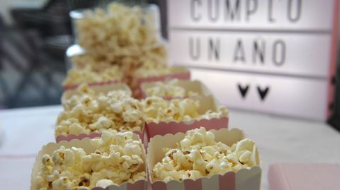 Las clásicas palomitas siempre son un éxito en un cumpleaños. Al microondas y listas en 3 minutos. Dan poco trabajo y huelen tan bieeennnn!!! Unos minicubitos de cartón son ideales para repartirlas.