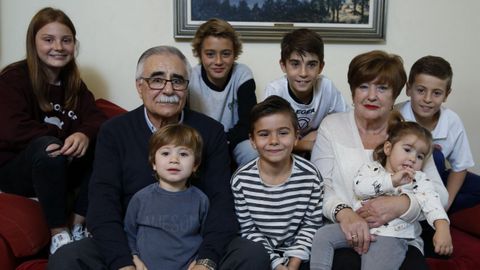 Si entras en casa de Miguel y Kety lo primero que te encuentras es a un renacuajo con una pelota entre las piernas. Es Mario. Uno de sus nietos más pequeños -acaba de cumplir los 3 - que me recibe con una enorme sonrisa a mí y a mis hijos. Porque en una de estas jornadas en que la conciliación se tuerce, me los he traído conmigo a trabajar. Pero en casa de Kety y Miguel, los superabuelos de este reportaje, los niños no molestan, así que mientras me siento y preparo mi grabadora, ya tienen delante dos boles de palomitas y una pelota de espuma para jugar al balón: «Yo les dejo jugar en el pasillo, que jueguen, ya les dejé en su momento a mis hijos y ahora también a los nietos», cuenta Kety, que en esto de criar sabe mucho porque tuvo cuatro hijos y ahora tiene nueve nietos: Hugo, de 13 años; Adrián, de 12; Pablo, de 11; Ana de 11; Mateo, de 10; Fernando, de 8; Martín, de 8; Mario, de 3 y Tina, de 18 meses. En la foto de hoy no están todos, pero en su piso de A Coruña es habitual que se junten varios a la vez, porque en esta casa se han ido cuidando todos. «Lo primero que quiero decir es que mis nietos para mí no son una obligación; yo los atiendo, les hago de comer todos los días, o se quedan a dormir, porque me gusta estar con ellos, me gusta ayudar a mis hijos y estoy encantada en este papel. Cuando oigo que alguna amiga me dice que eso no lo quiere para ella, lo respeto, pero a mí me encanta. Mis nietos son la razón de mi vida», señala Kety. A su lado, su marido, Miguel, la escucha atentamente como si no fuera con él. ¡Y vaya sí va! En este tándem de superabuelos él es una parte fundamental, «es el taxista oficial de la familia», me apunta Eva, una de sus hijas. «Él es el encargado de andar llevando y trayendo a todos los niños casi todos los días de la semana».