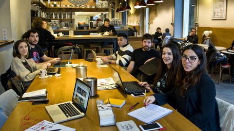 La conectividad es uno de los puntos fuertes del Vecchio, en A Coruña. Cualquiera de sus locales son una auténtica reunión de gente joven. Porque la foto no la sacamos en la biblioteca, aunque pueda parecer lo contrario. Fíjate bien y al fondo verás la barra. Que sí que sí, que esto es un bar. Con una pedazo de mesa, un wifi que va como un tiro y tantos enchufes como para abastecer a media clase de la uni. Y hablando de la uni, allí nos encontramos a este grupo de chicos y chicas haciendo un trabajo. ¿Dónde mejor que en casa? Pues aquí. «Aquí vienes con el portátil, estás cómodo en tu butaca y tienes un wifi de buena calidad. Por eso por las tardes nos llenamos de estudiantes para hacer trabajos con hasta diez ordenadores, o de gente que viene a trabajar», asegura Isabel Vecino, propietaria del local junto a su hermana Lucía. El modelo de servicio take away, dice, es otra de las claves de su éxito. Aquí uno pide, paga y se sienta en la mesa «para relajarse de verdad», sin estar pendiente de esperar a que le sirvan ni a que le cobren en un local, ante todo, que resulta confortable.
