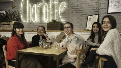En Ourense existen varios locales en los que ver a gente joven. Los hay en los que la música y la tapa de regalo son un reclamo y otros en los que se busca un poco de tranquilidad para poder conversar o saborear un postre casero. En este último grupo entra Charlotte, en la calle Bedoya de la capital ourensana. Aquí los refrescos se sirven tanto como los chocolates. Y las patatas fritas dejan un hueco a un pincho, a una tarta casera o unos crepes con nata. Desde adolescentes a jóvenes que van a la universidad, y sobre todo chicas, se reúnen para conversar y pasar un buen y largo rato. Es el caso de Paula Gómez Estévez, Paula Gómez Lois y Clara Vázquez. «Siempre que no sabemos adónde ir venimos aquí. Lo hicimos un día porque queda al lado de donde nos movemos y es diferente», apuntan. Lo importante es estar tranquilas y suelen quedar los viernes, después de las clases. Ellas son de crepes. «Además, los camareros son muy simpáticos y viene mucha gente de nuestra edad. Podemos estar una hora entera», añaden. Lucía Pato y Uxía Sequeiros también son fieles a su cita con Charlotte. «Hace un año más o menos que venimos. Nos gusta la decoración y el ambiente. No es ni una cafetería de gente mayor ni un tipo pub», explican. Y destacan: «Y no solemos estar con el móvil, lo que hacemos es hablar». En verano prefieren consumir un refresco, y para el invierno piden un chocolate. «La mayoría de las veces venimos las dos solas, pero en ocasiones nos reunimos con otros amigos», explican. Ellas eligen Charlotte cada semana durante el curso. En verano, sin embargo, las citas son más continuas. Mientras hablan, no paran de entrar jóvenes al local, aunque en Charlotte también se pueden ver a adultos con el ordenador o a una mujer madura leyendo entretenida un libro. Todos tienen cabida.