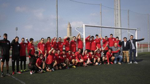 «Son muy obedientes, quieren hacerlo todo bien y aprenden a la primera. Yo he notado su evolución física, al principio sí había alguna descoordinación y el miedo lógico de ir al choque, al balón, pero como cualquier persona que empieza en esto», concluye Lucía, que por si acaso, mientras entrena, explica los movimientos con detalle. «¿Saltamos con las dos piernas?», pregunta uno de los futbolistas. «Primero una y luego la otra», responde Lucía. Antes de despedirme, este equipo unido y único posa para la foto con los brazos en alto, pero a estas alturas del partido no hace falta animarlos, les sale a ellos solos el grito de dentro, como los auténticos campeones que son: «¡Forza Dépor, oé!’».